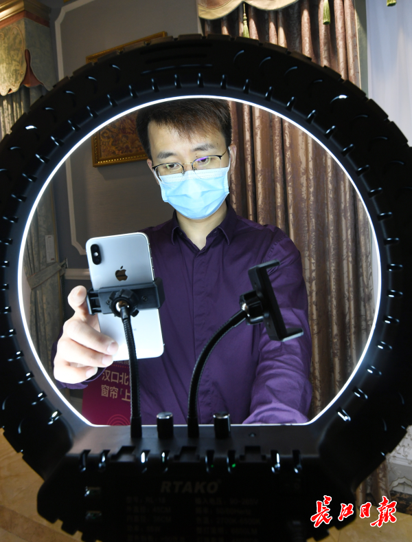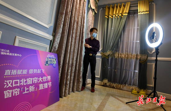 长江日报-长江网4月24日讯 24日,在汉口北窗帘大市场内,众多商家一改往日的坐店待客模式,店铺老板亲自上阵开展线上营销,变身“主播”推介产品。 面对疫情对实体经济带来的冲击,汉口北市场积极引导商户开展线上营销、线上无接触交易,有效带动线上批发交易和零售销售。