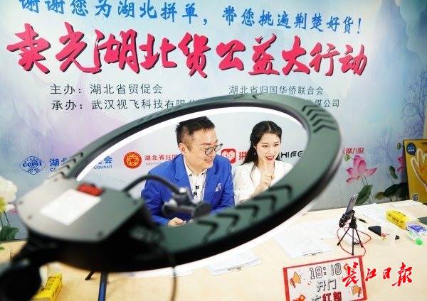 “卖光湖北货”公益活动现场,著名主持人田野、人气主播柠檬为湖北带货 记者何晓刚 摄