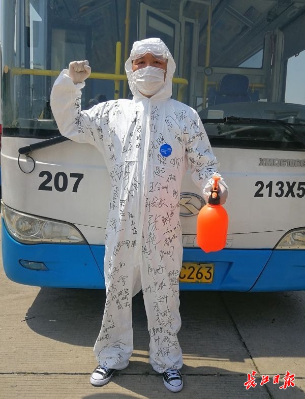 4月27日,武汉公交207路驾驶员冯艳斌穿着有援汉医疗队员签名的防护服 记者张宁 摄