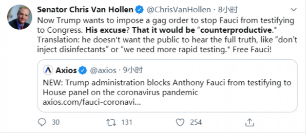 美国民主党参议员克里斯·范霍伦(Chris Van Hollen)指责特朗普对福奇强加“禁言令”。