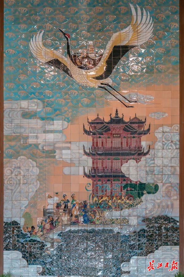网友通过直播镜头品读了黄鹤楼历史人文。主楼一楼大厅,陶瓷大壁画《白云黄鹤》由老艺术家周令钊设计并主持烧制,设计了驾黄鹤而飞的吹笛仙人和楼前人群欢聚景象。
