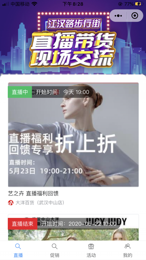 江汉路步行街的直播微信小程序中,多家商铺已开启直播带货活动