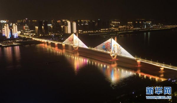 4月8日零时起,武汉市正式解除离汉离鄂通道管控措施,全市景观照明开启(无人机照片)。新华社记者 程敏 摄