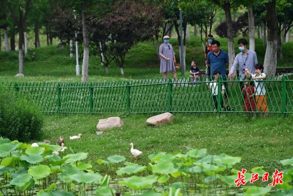 28日,府河郊野公园绿意盎然,花草丰茂,一些市民带着孩子来到公园赏花、游玩、骑行。公园水塘边,一群小鸭子蹒跚学步、梳理羽毛,让孩子们大呼好玩 记者李永刚 摄