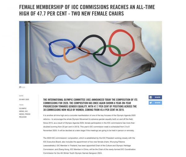 28日,国际奥委会官网发表题为《国际奥委会委员会的女性占比达历史新高的47.7%,两名新女性主席产生》的文章。文章说,在国际奥委会目前总共30个委员会中,女性委员的占比达到历史新高的47.7%,比2019年增长了2.3个百分点。
