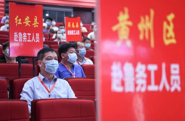 5月14日,即将赴鲁就业的湖北务工人员在湖北黄冈参加《鄂鲁支持贫困劳动力外出务工暨劳务协作帮扶协议》签约仪式。新华社记者 程敏 摄