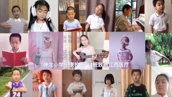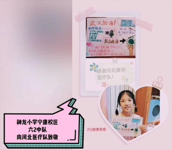 “当危险来临的时候,是他们用汗水和热血,建起我们心中最安全的防线”……武汉经济技术开发区神龙小学宁康校区一(4)班全体学生,用童言稚语隔空向援汉江西医疗队致敬。活动期间,全校48个班级为31支援鄂医疗队送上真挚的祝福,大家事先了解各医疗队的先进事迹后,用手抄报、书信、贺卡、视频等多种形式,向心中的英雄表达崇高的敬意。