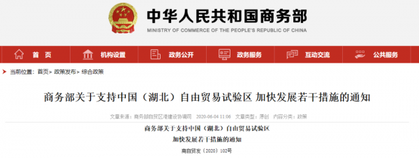 《商务部关于支持中国(湖北)自由贸易试验区加快发展若干措施的通知》