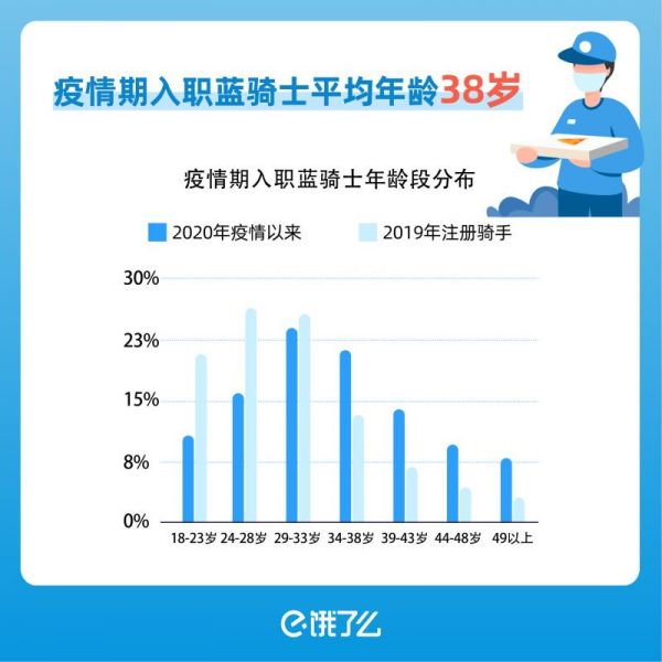 饿了么数据显示,疫情防控期间,入职蓝骑士平均年龄38岁,高于疫情前全国骑士整体平均年龄31岁。在主业受到影响时,兼职的蓝骑士通过副业平均每月多赚2900元,送外卖平均占到家庭总收入4成。在湖北,兼职骑士平均每月多赚3078元,高于全国平均水平。