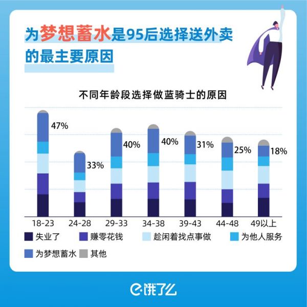 像童先生这样的蓝骑士还有很多。根据调查,95后群体中送外卖主要是为梦想蓄水,而在49岁以上的群体中,送外卖的第一大原因是遭遇职场“中年危机”,送外卖为他们兜底个人梦想和家庭经济,提供另一种可能。