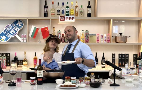 保加利亚驻上海总领事馆商务领事王思在宁波直播间现场当起大厨,制作保加利亚美食。“买它!非常好!”王思在直播间用中文推广产品。(图片由展览主办方提供)