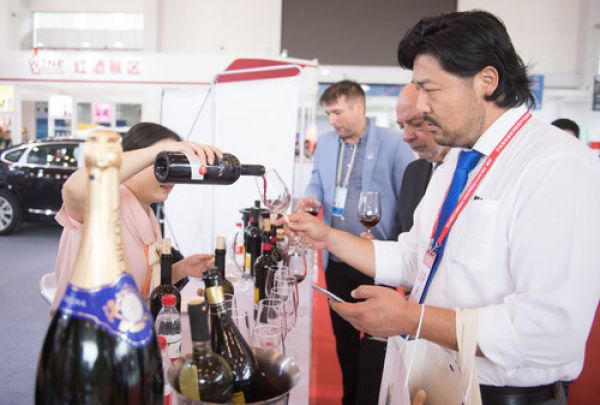 2019年6月8日,首届中国-中东欧国家博览会在浙江宁波开幕。参观者品尝产自摩尔多瓦的葡萄酒。(新华社记者翁忻旸摄)