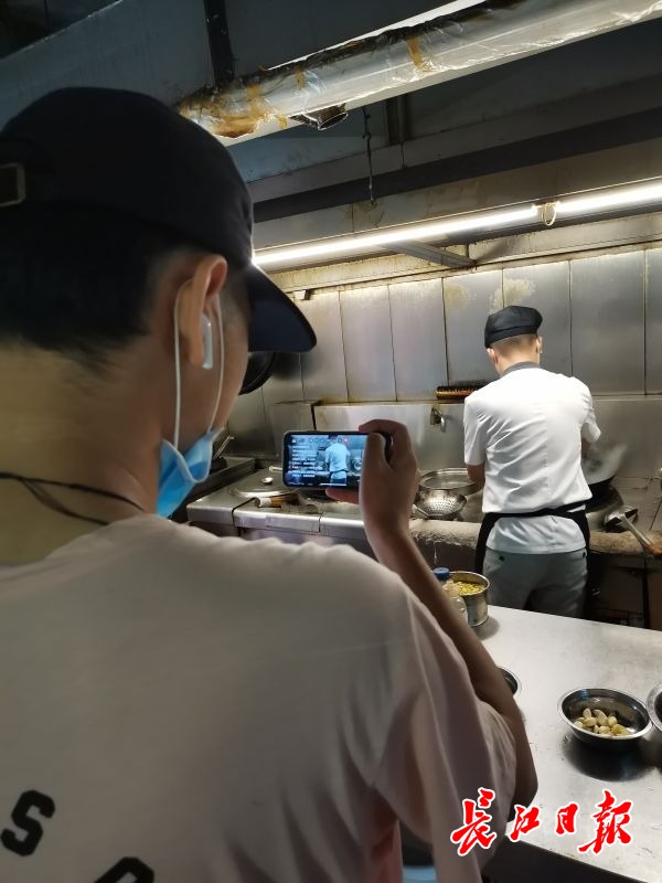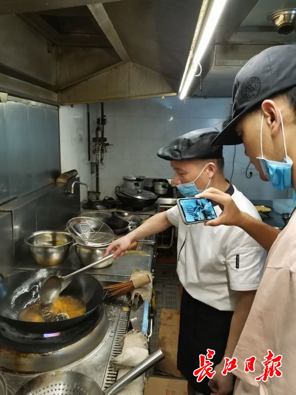 “热油要均匀浇到鱼身,表皮微黄后出锅。”上午10点,长江日报-长江网记者来到老白鱼庄后厨时,厨师长正忙着在线直播教学。从鲜鱼腌制,到下锅烹制,整个流程都以直播的形式展示。厨师长还现场与网友互动,交流在家制作的小窍门。半个多小时的“教学”时间里,直播群里涌进上千网友。