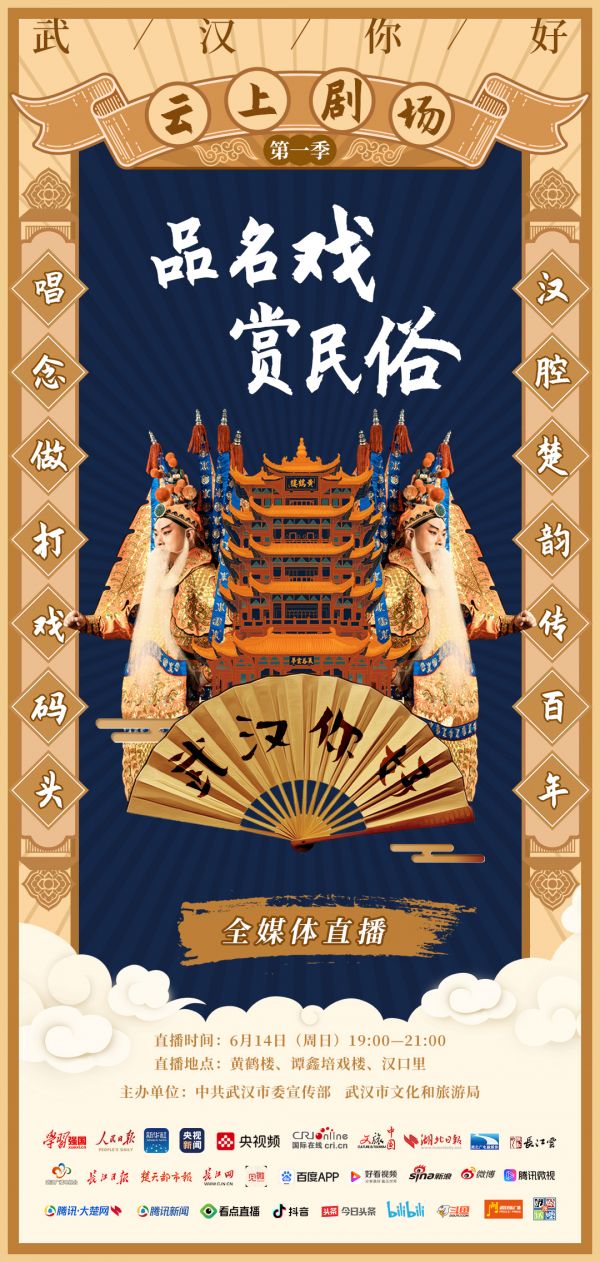 当锣鼓声再次响起,戏码头辉煌再现。6月14日,品名戏·赏民俗——“武汉,你好!”云上剧场戏曲专场,将在黄鹤楼、谭鑫培戏楼、汉口里开启全媒体直播,展示武汉百年戏曲的魅力。此次直播,武汉京剧院、武汉汉剧院和武汉楚剧院将带来《定军山》、《红桃山》、《百花亭》、《万里茶道》等代表性剧目,展示武汉振兴戏曲大码头、推动戏曲传承的成果。黄鹤楼前,刘子微、夏青玲、王荔三大名家将带来戏曲联唱《我爱中国》。直播中还将邀请戏曲名家画戏剧脸谱、讲解曲艺知识等,开启京、汉、楚演员与网友互动,穿插绝活大PK、跨界翻唱、跨界合唱、话题讨论等互动环节。学习强国、人民日报、新华网、央视新闻以及长江日报等近40家媒体将同时开启直播。