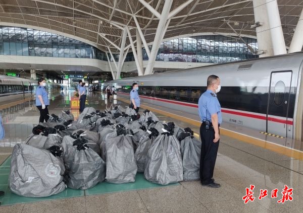 6月18日,武汉站和中铁快运武汉分公司等单位密切配合共同开启“高铁极速达”绿色通道,组织安检公司派专人协助中铁快运在站内快速安检、确保货物安全,每趟车安排专人在站台盯控转运、装车各环节,防止货物污染和途中破损,全力做好“高铁带货”的运输服务,确保了趟趟快速装运、安全正点。