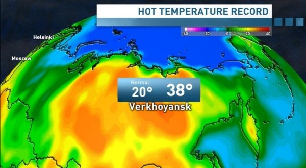 据报道,不仅是加拿大,俄罗斯北极地区在内也在同期出现高温天气,维尔霍扬斯克(Verhoyansk)在6月20日甚至出现了气温高达38摄氏度的热浪。