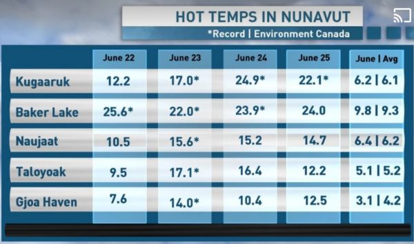 以6月25日为例,努纳武特地区的大部分区域都出现了罕见的高温。在位于北极圈内的库加鲁克(Kuggaruk),当天的最高气温达到22.1摄氏度,比往年同期最高气温6.2摄氏度高出3.5倍。而在北极圈外侧的贝克尔湖(Baker Lake)地区,最高气温高达24摄氏度,是往年同期最高温度9.8度的近2.5倍。