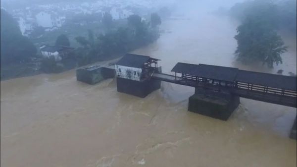 7月8日下午开始,婺源县大鄣山乡、清华镇一带山洪狂泄、河水猛涨,水位迅速抬升。清华镇一座拥有800多年历史的廊桥——彩虹桥桥面被洪水淹没超1米。受洪水巨大冲击,彩虹桥东端引桥至二号桥墩之间的桥面(两廊一亭)被冲毁,其余桥体基本完好,淹没在洪水中的“燕嘴分水”桥墩依旧无恙。经过千百年的风风雨雨,彩虹桥再次向世人证明了它的设计精妙,彩虹桥的防洪体系设计也充分体现了婺源古人的建筑智慧。