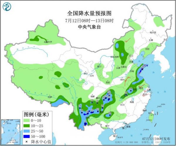 预计12日白天至夜间,重庆、贵州西部和北部、云南中东部、广西北部、湖北东部和西南部、安徽北部和西部、江苏北部及山东东部、河南南部、河北北部等地的部分地区有大到暴雨;最大小时降雨量20~50毫米,局地有雷暴大风等强对流天气。