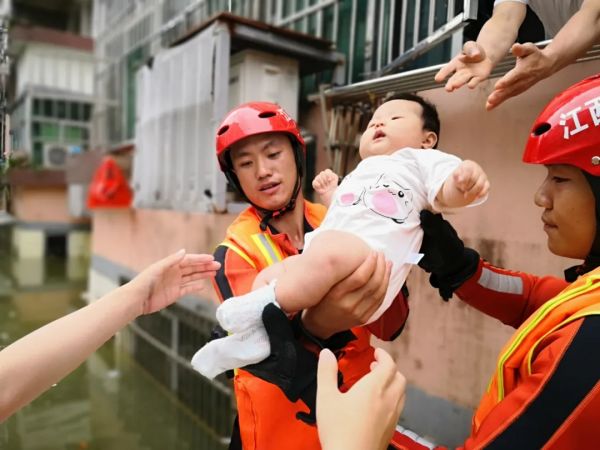 7月9日,江西省景德镇市茶山路有一名女子带着7个月大的婴儿,被洪水困在家中3天,消防员到达现场后,从窗口接力将婴儿抱出。(图片来源:应急管理部消防救援局)