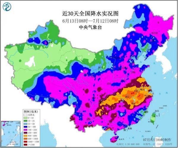 近30天(6月13日—7月12日)我国降水实况图(图片来源:中央气象台)