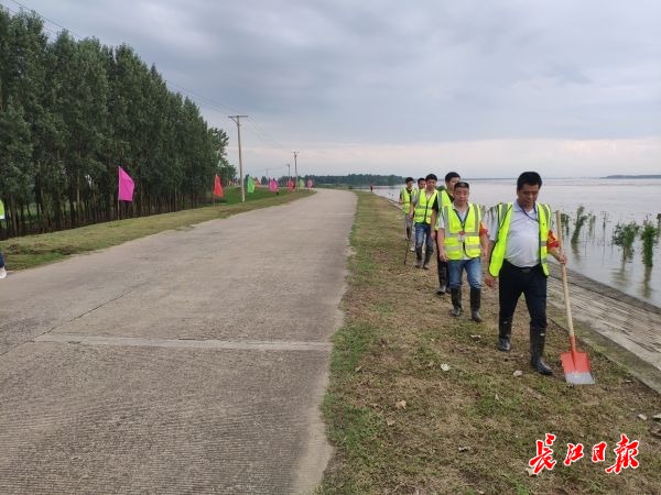 江夏经发投集团防汛人员正在巡查大堤。记者张奔设 摄