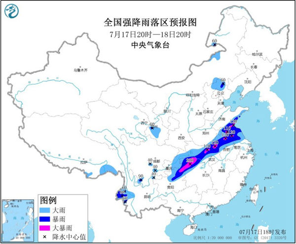 预计,7月17日20时至18日20时,黄淮南部、江淮、江汉大部、湖南北部、西南地区东部以及甘肃东部、云南西部、华北北部等地部分地区有大到暴雨,其中,山东南部、江苏北部、安徽中北部、河南东南部、湖北北部和西南部、湖南西北部、重庆东南部及贵州北部等地的部分地区有大暴雨(100~200毫米)。上述部分地区伴有短时强降水(最大小时降雨量30~50毫米,局地可超过70毫米),局地有雷暴大风等强对流天气。