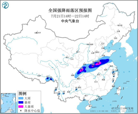 预计,7月21日14时至22日14时,陕西南部、四川东北部、重庆北部和西部、湖北北部、河南中南部、山东南部、安徽北部、江苏北部以及西藏东南部等地部分地区有大到暴雨,其中,四川东北部、河南西南部和中部等地局部地区有大暴雨(100~160毫米)。上述部分地区伴有短时强降水(最大小时降雨量30~50毫米,局地可超过70毫米),局地有雷暴大风等强对流天气。