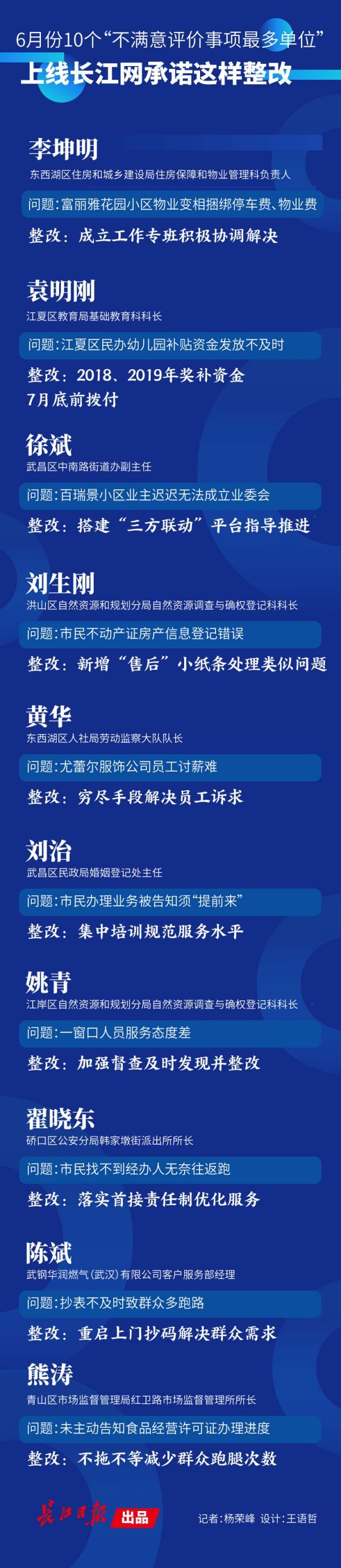长江日报-长江网7月21日讯(记者杨荣峰)“民办幼儿园2018年及2019年奖补资金7月底前拨付”“穷尽手段帮员工讨回薪水”“重启上门抄码解决群众需求”……21日上午9时30分至11时30分,6月份10个“不满意评价事项最多单位”上线市网上群众工作部·长江网武汉城市留言板,上述单位负责人上线市网上群众工作部·长江网武汉城市留言板,现场承诺整改、接受监督。