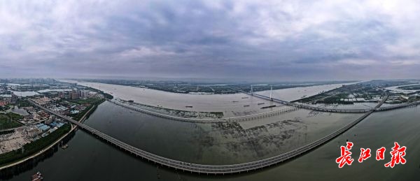7月21日,沌口通顺河与长江交汇处,大片的滩涂被江水淹没,只剩下一些绿色植物露出水面,如同浮萍一样。记者李子云 摄