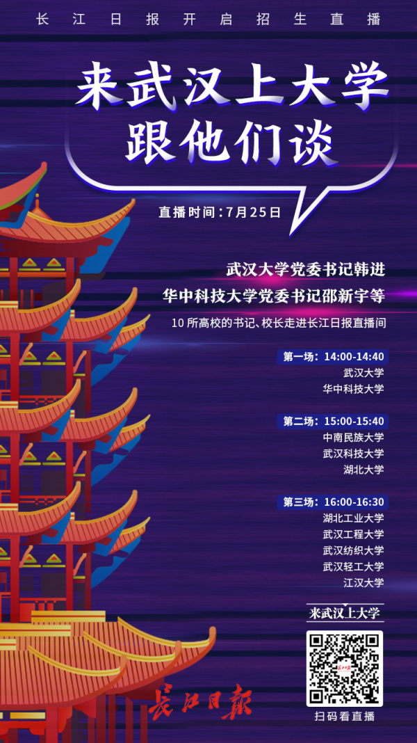 长江日报-长江网7月25日讯(记者陈智)今天下午2时,长江日报将举办线上直播推介活动,邀请全国考生报考武汉高校,来“英雄之城”上大学。