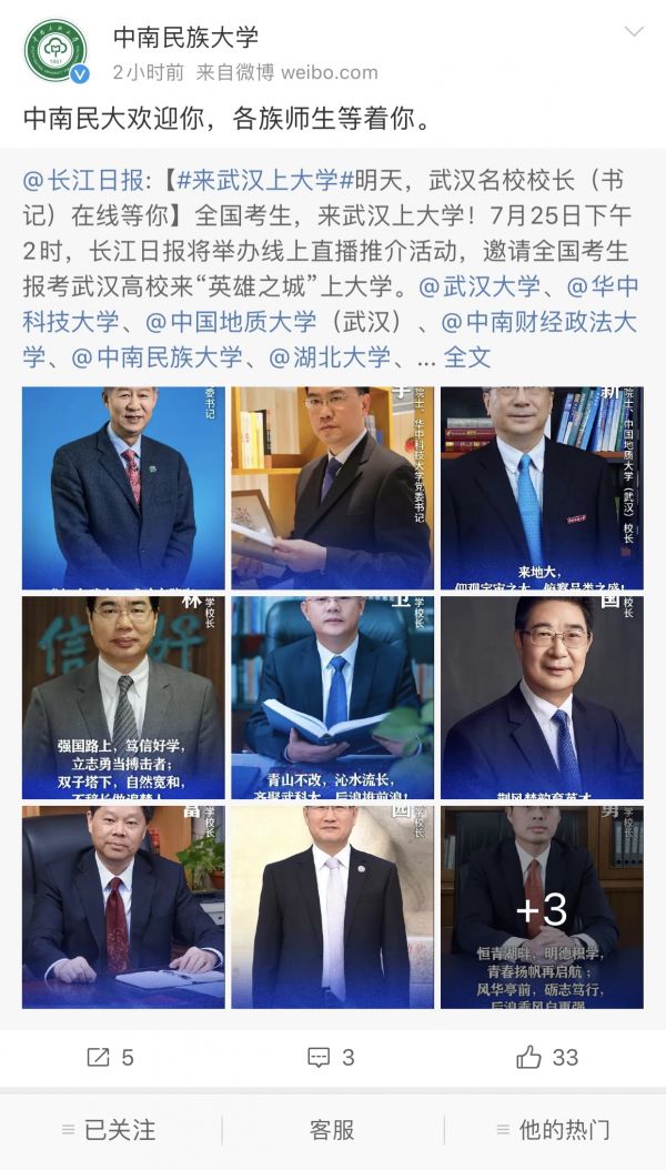 “中南民大欢迎你,各族师生等着你。”武汉各大高校也诚意满满,在学校的官博、官微上预告直播了此次直播。