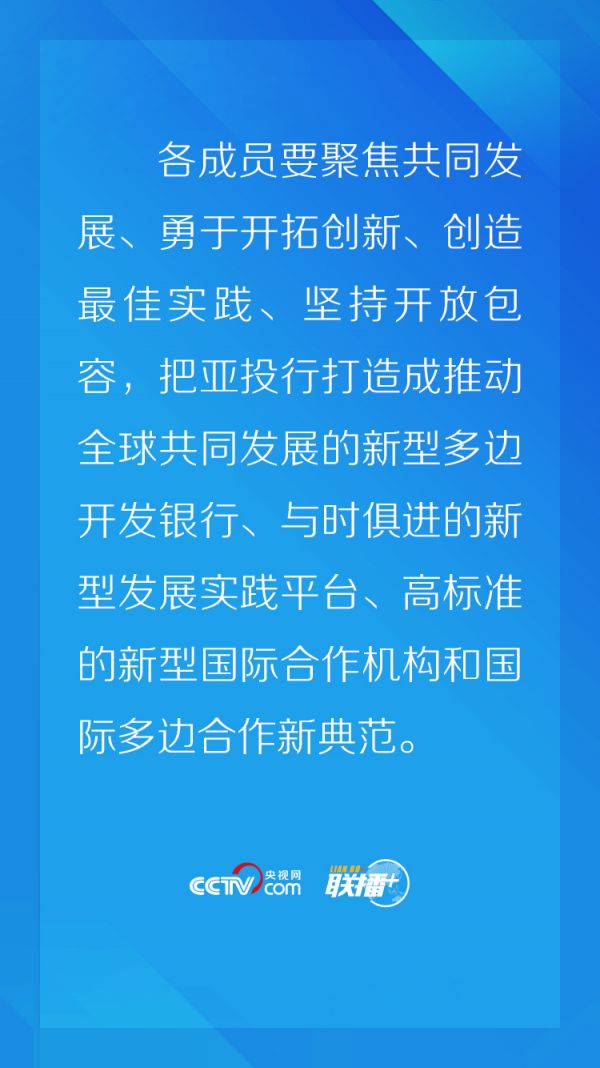 第一,聚焦共同发展,把亚投行打造成推动全球共同发展的新型多边开发银行。和平与发展仍然是我们这个时代的主题。基础设施互联互通是助推各国共同发展的重要物质基础。亚投行应该致力于服务所有成员发展需求,提供更多高质量、低成本、可持续的基础设施投资,既要支持传统基础设施,也要支持新型基础设施,为促进亚洲及其他地区经济社会发展提供新动力。