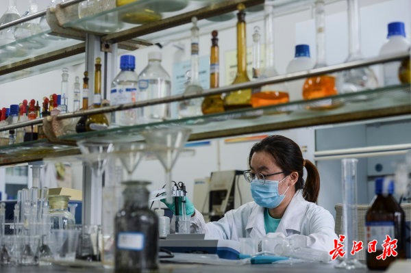 7月29日,在武汉科林化工集团公司化验室,实验人员正在检测催化剂原材料。记者胡冬冬 摄