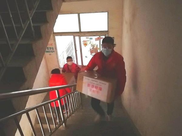 该社区位于远城区,下辖16个小区,2735户居民,总计11000多人,以老人居多。而社区只有11名工作人员,志愿者和下沉党员人手奇缺,每天任务繁重。梅老师每周除了完成线上课堂教学任务,其他所有时间都扎根于社区,全天候待命。工作时间从上午8:30到晚上20:30,没有一天休息。每天工作任务是为社区居民发放生活物资、买药、慰问困难户、空巢老人,协助卡点执勤,进村入户宣传防疫知识,发放体温计等。哪里缺人,随叫随到,经常是忙得不可开交。由于是老旧小区没有电梯,每天背着沉重的物资上下楼梯已经成为常态,有时大冬天全身衣服都被汗水湿透。
