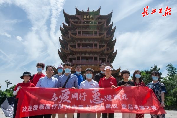 援鄂医疗队成员在黄鹤楼景区合影。记者胡九思 摄