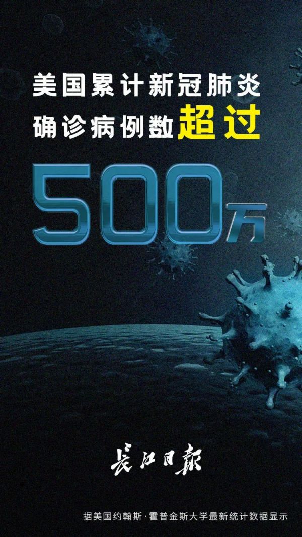 ◇ 美国约翰斯·霍普金斯大学统计数据显示,美国新冠累计确诊病例已突破500万例,累计死亡病例超过16万例。