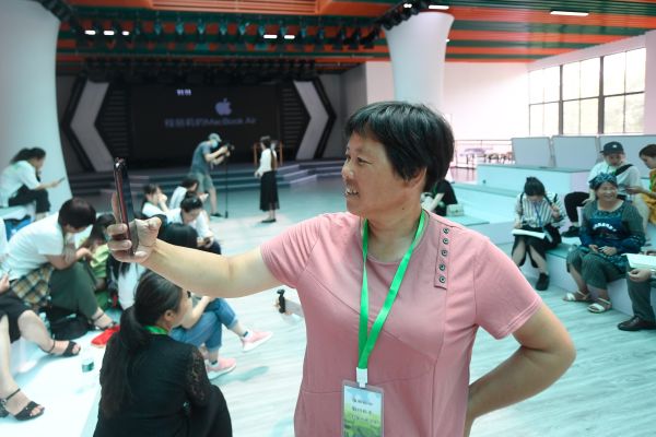 在衢州市柯城区万田乡乡村振兴综合体,来自九华乡上清村的村民姜雪梅在练习使用手机直播(7月18日摄)。