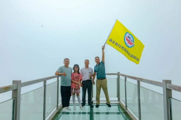 车队一行穿行美丽的英山,一一打卡英山最具代表性的景点,包括大别山主峰景区、龙潭河谷、四季花海、乌云山茶叶公园等。在大别山主峰景区百米玻璃桥上,大家高举自驾联盟旗帜,感叹欢呼。