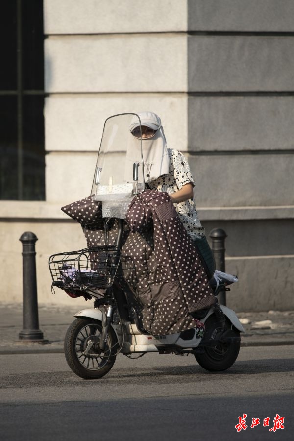 8月24日是今年“三伏天”的最后一天。当天上午,武汉街头全副武装的骑车市民。记者金思柳 摄