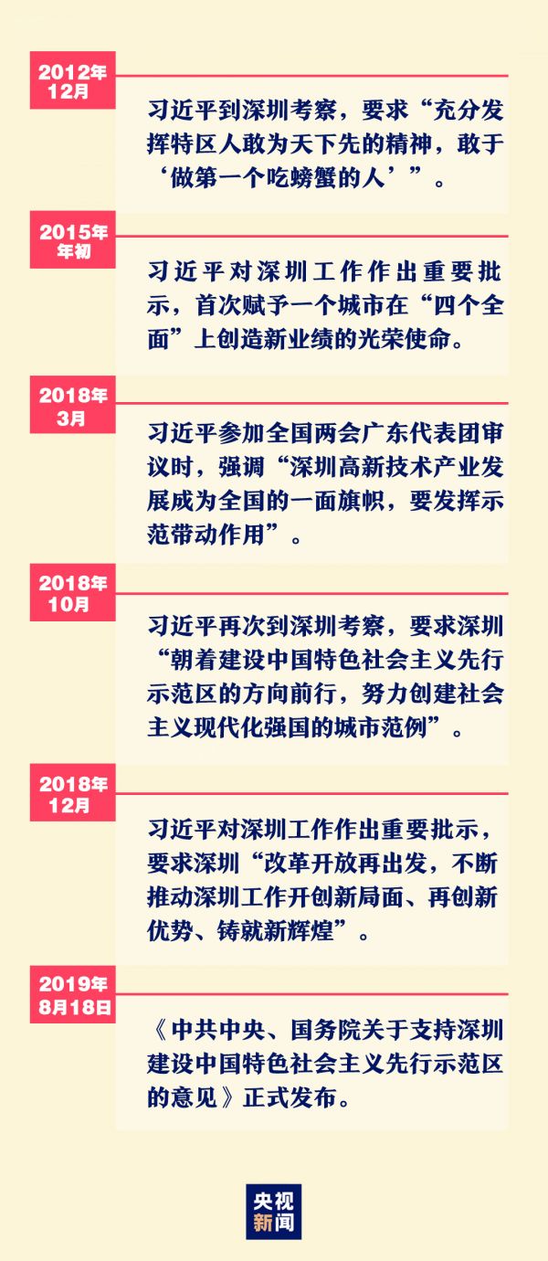 在习近平总书记的亲自谋划、亲自部署、亲自推动下,2019年8月18日,《中共中央、国务院关于支持深圳建设中国特色社会主义先行示范区的意见》正式发布。这是继兴办经济特区后,深圳迎来的又一重大历史机遇。从试验田到先行示范区,深圳承载的不仅是改革开放的先锋使命,更是中华民族伟大复兴的责任与担当。