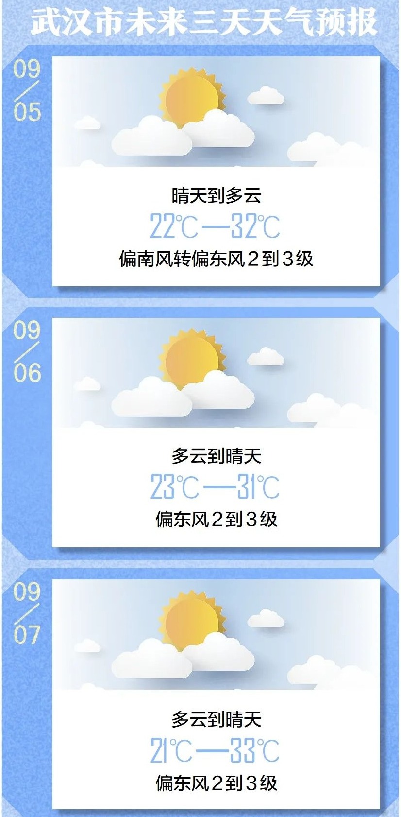 周末两天,武汉最高气温仍然会超过30℃,意味着白天的正午还挺热的。来自武汉市气象部门的监测,4日最低气温21.5℃,最高气温33℃。 预计未来三天,受到高空偏北气流控制,武汉保持晴到多云天气,但早晚气温舒适,习惯户外锻炼的人可是有福了。提醒周末打算出游的朋友,由于早晚凉爽,昼夜温差较大,建议老人和小孩外出时携带轻薄外套,以免着凉。