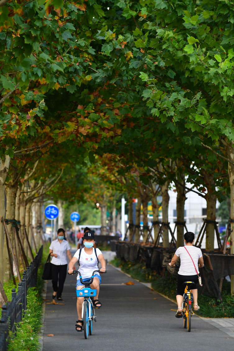 9月4日清晨,天气凉爽。三阳路上,众多上班族从地铁出站后,选择骑行共享单车前往工作单位。记者李永刚 摄