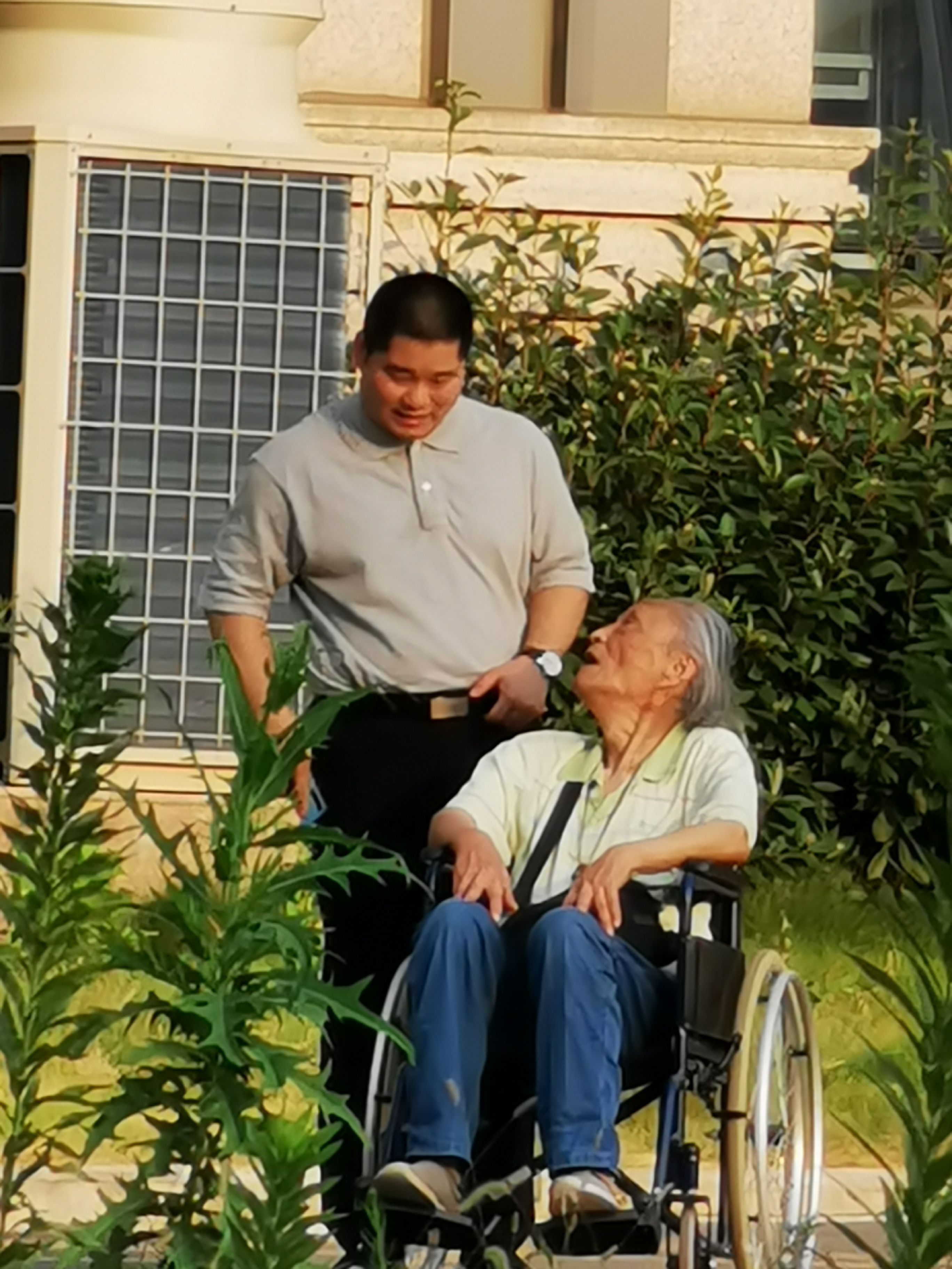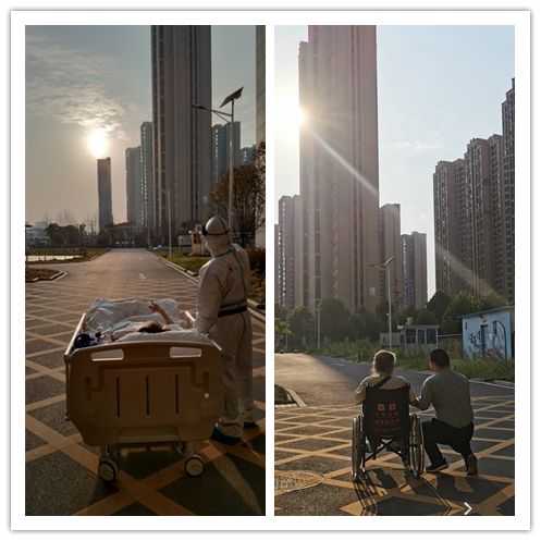 刘凯说,3月初,老人病情好转,需要做CT检查看看恢复的情况。做完检查回病房的路上,正是夕阳余晖满天,“我就问老人家要不要停下来看看太阳,老人说,好。” 这一幕被一位志愿者用手机记录下来。