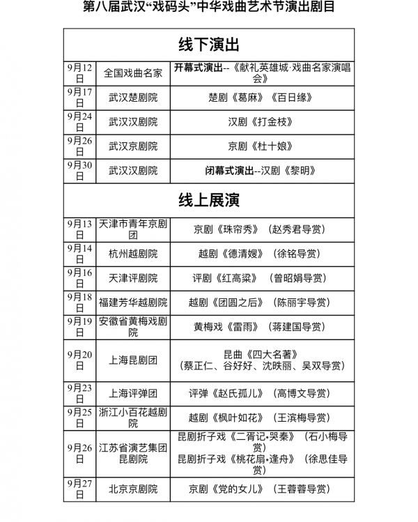 9月12日-9月30日,10个剧种、16场演出,数十位名家都将通过网络直播和广大戏迷见面。北京京剧院的《党的女儿》、上海昆剧团的《四大名著》、浙江小百花越剧院的《枫叶如花》、安徽省黄梅戏剧院的《雷雨》等等名团大戏,都将亮相“云端”。王蓉蓉、石小梅、谷好好、蒋建国等戏曲名家,还将透过网络在开演前为戏迷们进行导赏。本地的京、汉、楚三大院团,还将在汤湖戏院带来三场线下剧场演出。