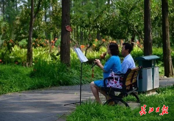 7月24日,青山倒口湖防洪科普公园紫薇、睡莲等十多种花卉盛开,不时有市民在公园内散步、吹奏器乐。记者李永刚 摄
