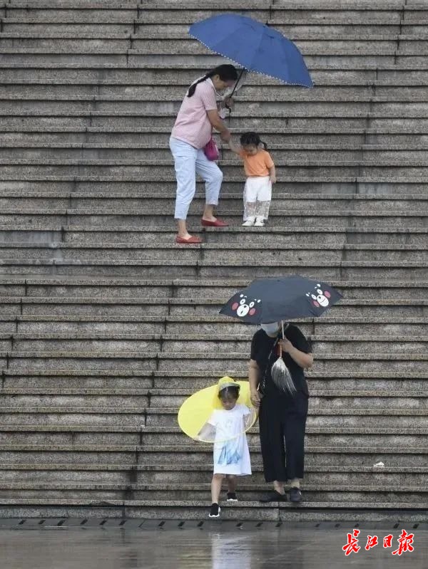 7月26日上午,在琴台剧院广场,两位家长带着孩子在雨中散步。记者金思柳 摄
