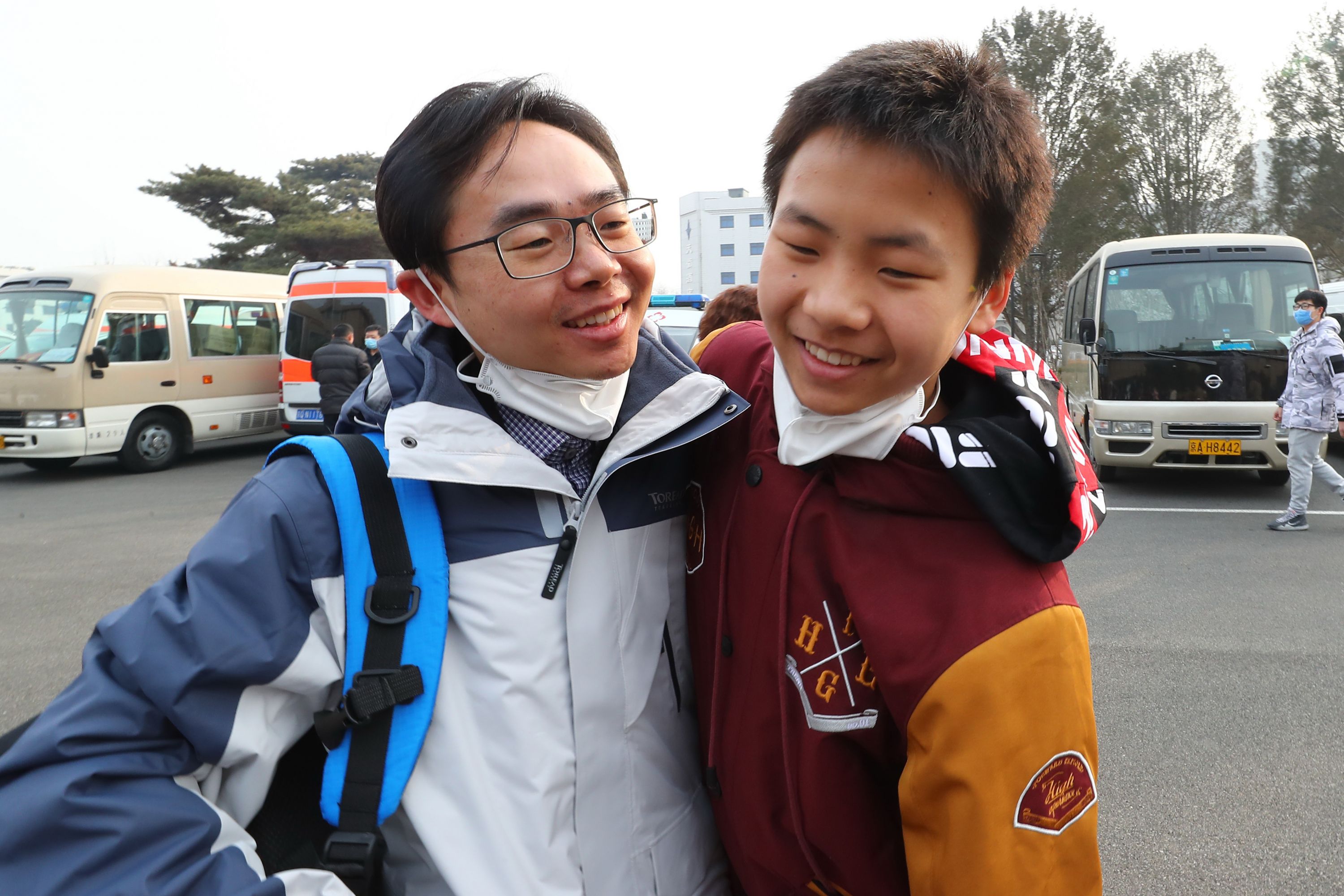 1月26日,由121位医护专家组成的国家援鄂抗疫医疗队启程奔赴武汉。这是国家援鄂抗疫医疗队队员、北京医院外科ICU副主任常志刚(左)与儿子在首都国际机场告别。新华社记者张玉薇 摄