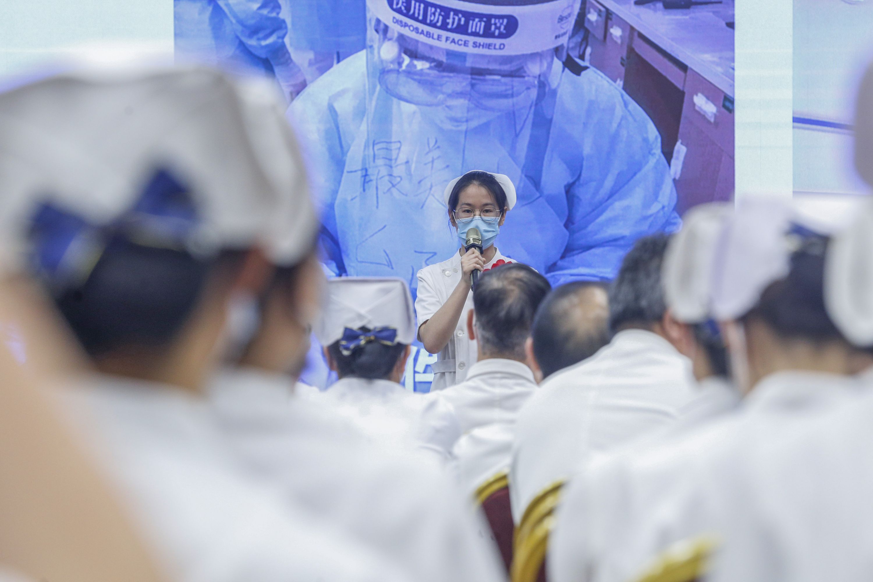 5月11日,北京大学人民医院举办庆祝护士节暨优秀集体和个人表彰活动。这是援鄂医疗队队员代表邰晶在活动上分享战“疫”故事。新华社记者张玉薇 摄