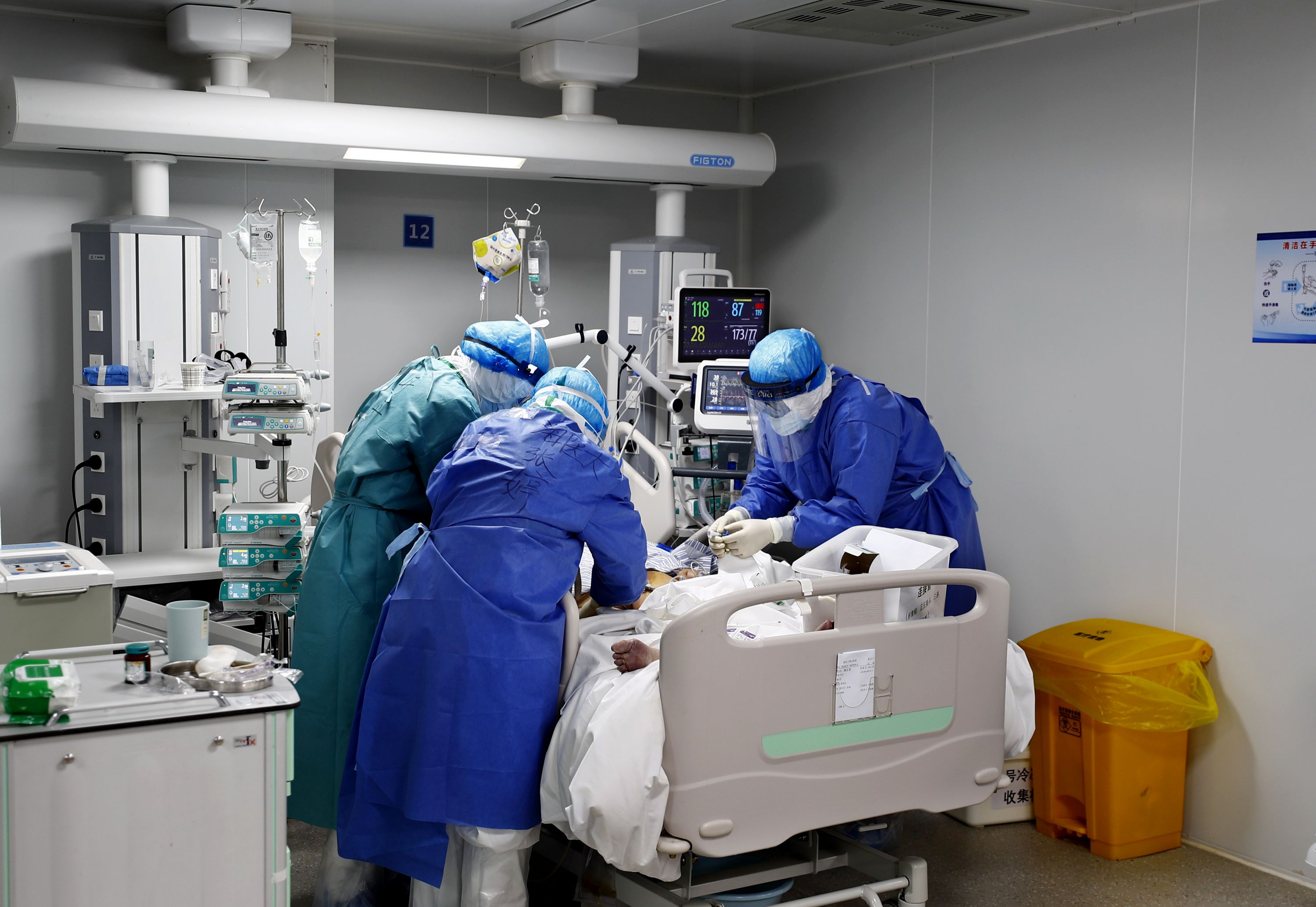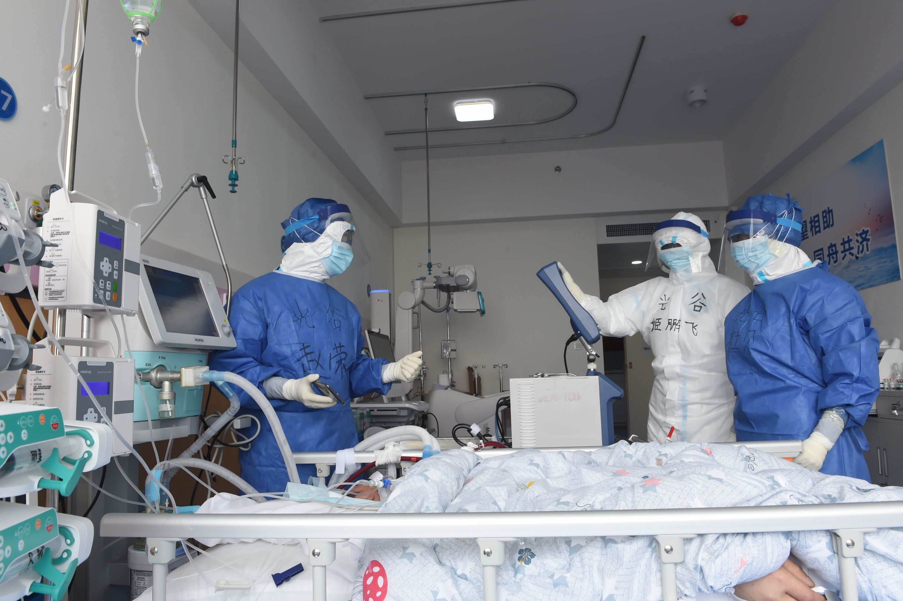 武汉火神山医院重症一科医护人员为患者做气管插管手术(2月24日摄)。新华社发(王皓宇 摄)